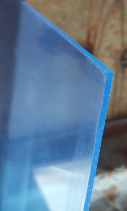 Plexi mi došlo po pár dnech po objednávce, poctivě zabalené v kartonu a oblepené fólií. Spíš než čiré je tedy dost výrazně modré, tak barva je umocněná ochrannou fólií. Tenhle materiál je dost ohebný, úplně to na tento účel nevadí, ale to klasické, tuhé plexi to teda není. To by zřejmě muselo být buďto plexi lité nebo polykarbonát – to je cenově trochu někde jinde, a mě pro moje účely asi postačí tohle.