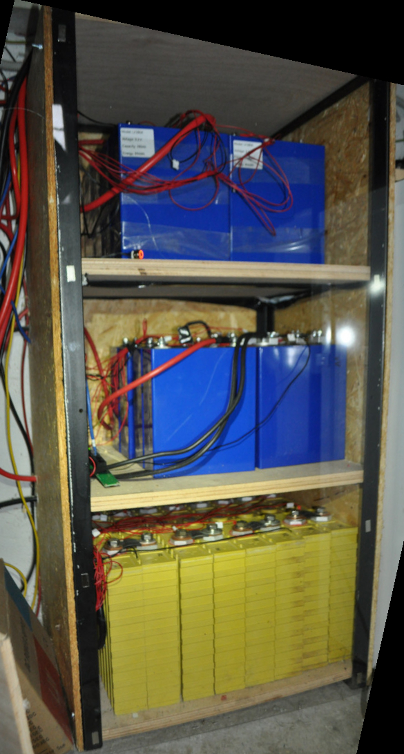 Novým bateriím z ELE článků 280Ah jsem postavila provizorní boudičky z OSB desek. Tohle řešení bylo neúsporné na spotřebované místo, protože baterie se nedaly štosovat nad sebe, a neumožňovalo už prakticky žádné další rozšíření bateriové kapacity a přinášelo chaos do připojovací kabeláže.