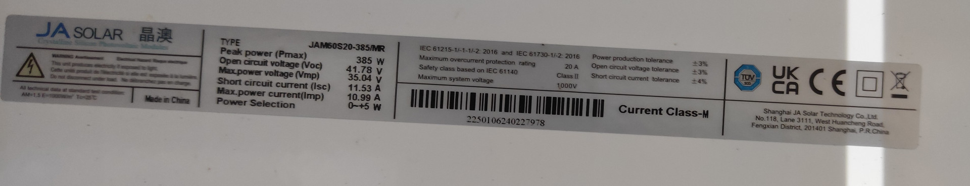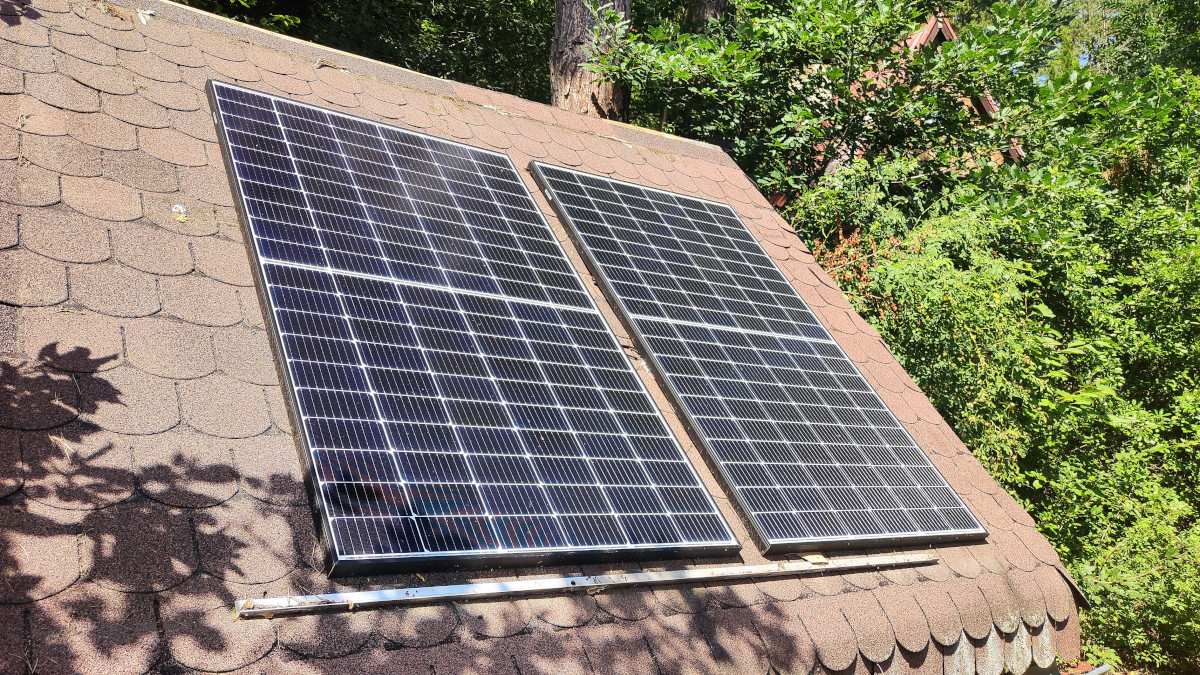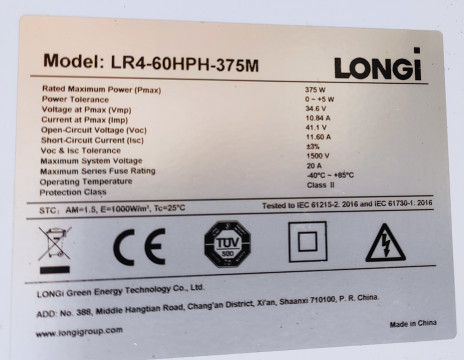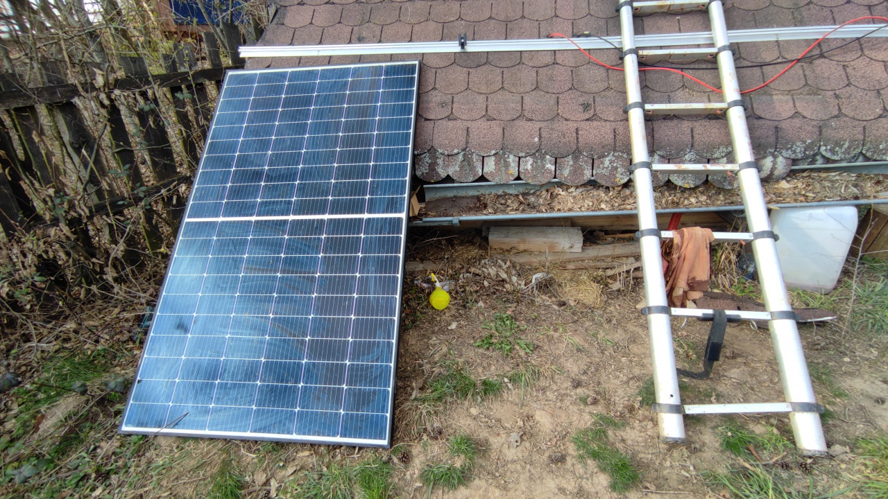 Loni v květnu jsem spustila nový jižní string 2s3p z panelů Risen (400Wp, Voc 41.3V / Vmp 34.39) na nové konstrukci – celkem 400 x 6 = 2400Wp. Z minulých verzí mi tak zbyly dva panely Longi LR4-60HPH (375Wp, Vmp 34.4V / Voc 41.1V) instalované na seníku, a na terase třetí panel, o kterém jsem si též myslela, že jde o Longi, ale ve skutečnosti jde o JA-Solar JAM60S20-385/MR (385Wp, Vmp 35.04V / Voc 41.78V, ISC 11,53A). No, takže to bude tak trochu Frankenstein, ale elektricky si to sedne docela dobře, uvidím, jak se bude chovat Victron regulátor při hledání MPPT (aktuálně od 96 do 107V podle úhlu osvitu, stínů a teplotě).