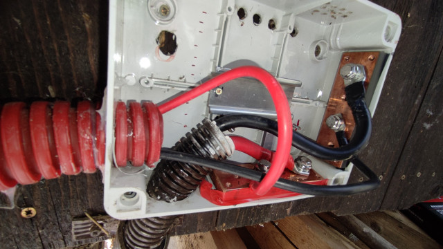 Druhý krok bylo vyspravení děr po předchozích montáží asfaltovou stěrkou. Uvidím, jak těsné to bude. Taky jsem v této fázi demontovala všechny staré vodiče zevnitř – byla tam změť 10mm2 a 6mm2, zbytky určitě v budoucnu najdou uplatnění. Místo těch starých jsem tam dala jediný 5m 6mm2 vodič na oba póly.