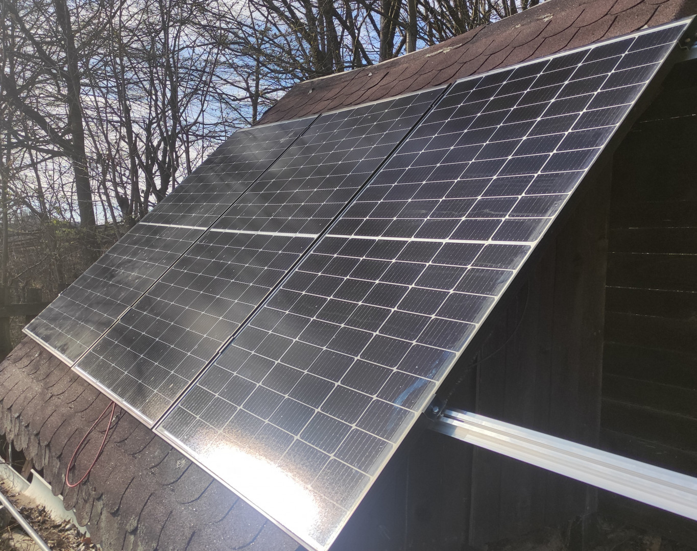 Seník má už bohatou historii rekonstrukcí své krytiny. V roce 2010 nesl dva Schott 100Wp panely, o rok později už čtveřici těchto amorfů. O deset let později jsem už pokukovala o navýšení výkonu, a nejlepší postup se mi zdál nahradit 100Wp amorfy za 375Wp moderní monokrystaly, a s kolegou kontrabasistou jsme provedli rekonstrukci jižního pole na seníku.