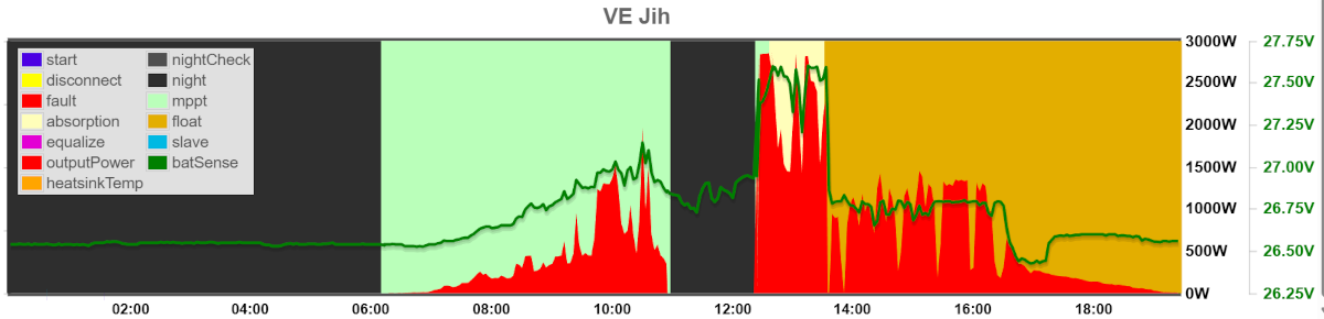 Výsledek potěšil, ale nepřekvapil: regulátor šel okamžitě na maximální výkon 100A. Baterie byly ovšem už skoro nabité, takže regulátor přešel hned do absorpce. Ten den bylo oblačno, a zdá se, že přepanelování prospělo i v ohledu pomalého MPP Victrona – ten se teď nachází v regulaci prakticky pořád, takže pro něj typické ulítávání napětí nahoru neznamená žádnou významnější ztrátu výkonu.