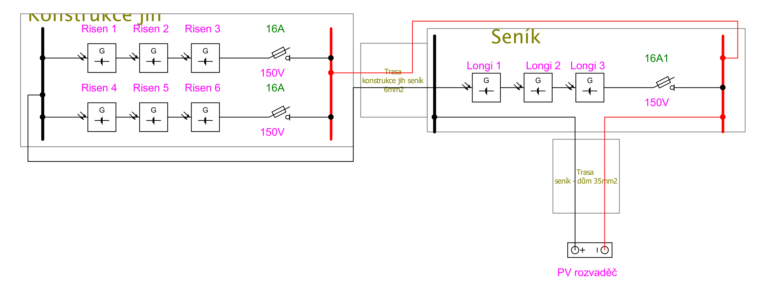 Do krabice na seníku bude třeba protáhnout dva nové 6mm2 vodiče od série panelů Longi, a propojit to se stávajícími kabelovými trasami. Kladný pól přes 16A pojistku. Protože budu muset propojovat 35mm2 kabely, spoj bude nutné provést kabelovými oky na měděných šínách, podobně jako v PV rozvaděči.
