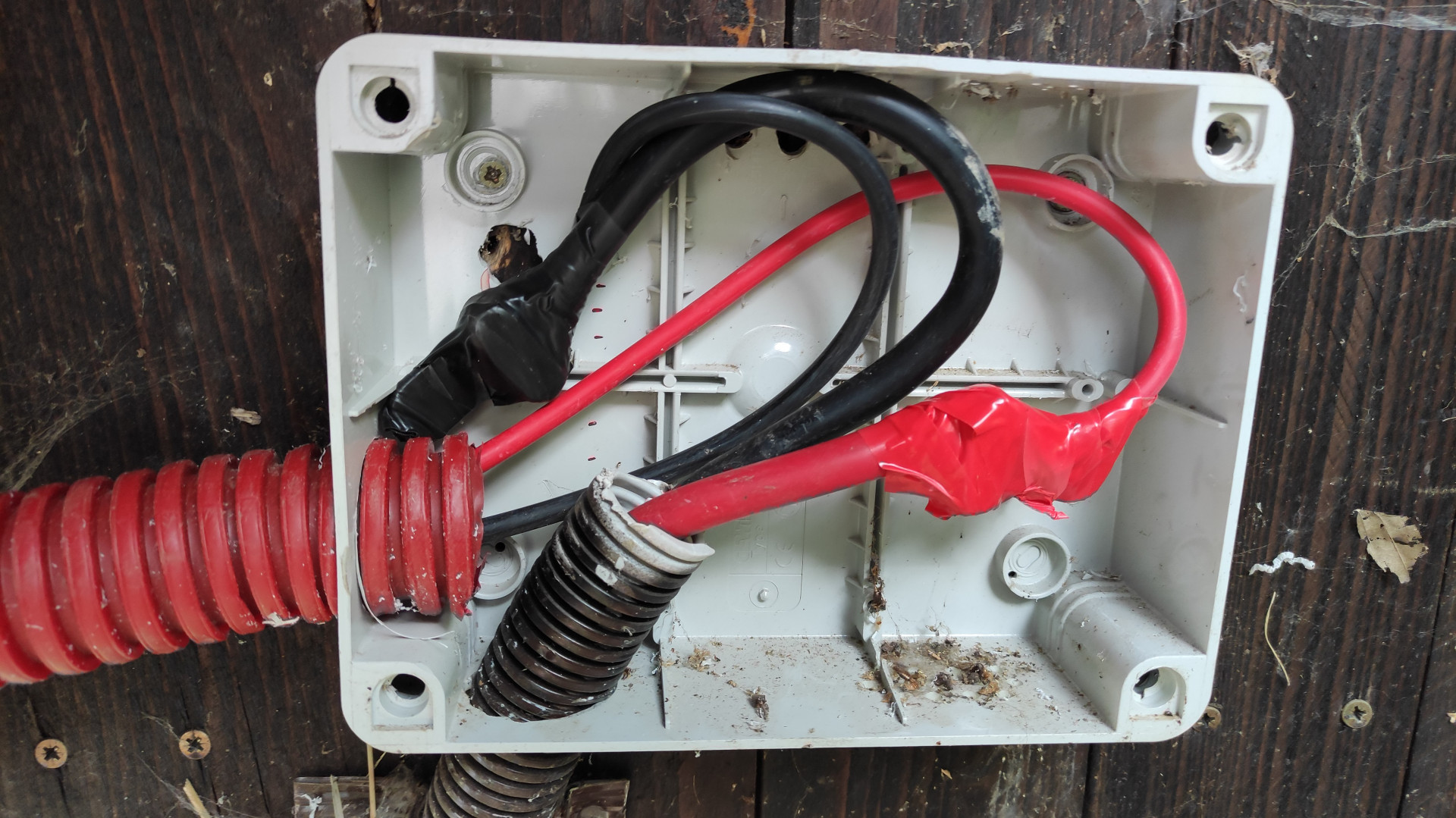 Při montáži dvojice Longi panelů v létě 2022 jsem tehdy omylem přepólovala připojné vodiče v seníku do krabice. Tuhle chybu jsem naštěstí odhalila a opravila ji v přípojné krabici, ale vodiče v seníku jsou tím pádem špatně barevně značené. Krom toho seník si uvnitř zachoval původní 15 let starou kabeláž, kdy jsem propojovala všechny původní amorfní panely paralelně, později 2s2p – jinými slovy, v seníku je ve výsledku změť vodičů s nepasující barvou, kterou bude jednodušší úplně vykuchat a nahradit čistou instalací. Z krabice na seníku jsem při zprovoznění 2,4Wp pole už staré vodiče zcela vytáhla a kabeláž mezi od seníku k domu a od jižní konstrukce k seníku provizorně propojila. Krabice teď vypadá takto: