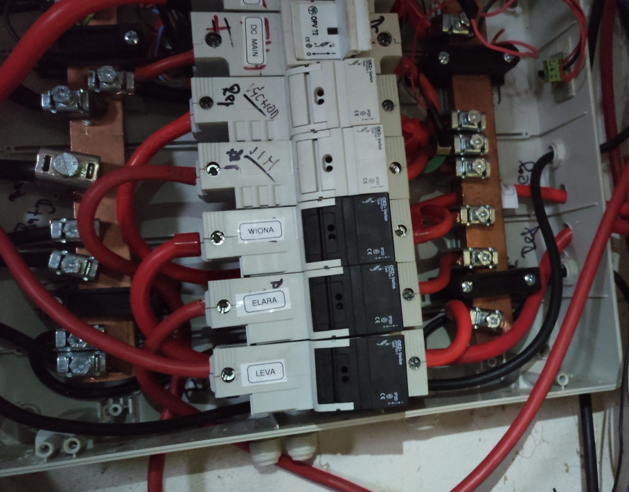 Připojení jsem provedla tak, že jsem nejdřív kompletně vypnula elektrárnu, zkontrolovala, zda na sběrnách nemám žádné napětí. Naposledy jsem taky zkontrolovala utažení spojů. Pak jsem ke sběrnici připojila plně nabitou Levu, zapnula jsem ji a připojila zátěž. Valc jsem přenastavila na SOC 50%. Valc zapnul měnič a přepojil i zátěž na Levu a začal ji pomalu vybíjet. Její napětí pomalu klesalo, až dosáhlo napětí 26,4, s rozdílem mezi články pod 4mV. Pak jsem připojila pojistky Elary, poté Wiony, od této chvíle jedou baterie paralelně. Žádné vyrovnávací proudy jsem nezaznamenala, i když zátěž živí převážně daleko více nabitá Leva.