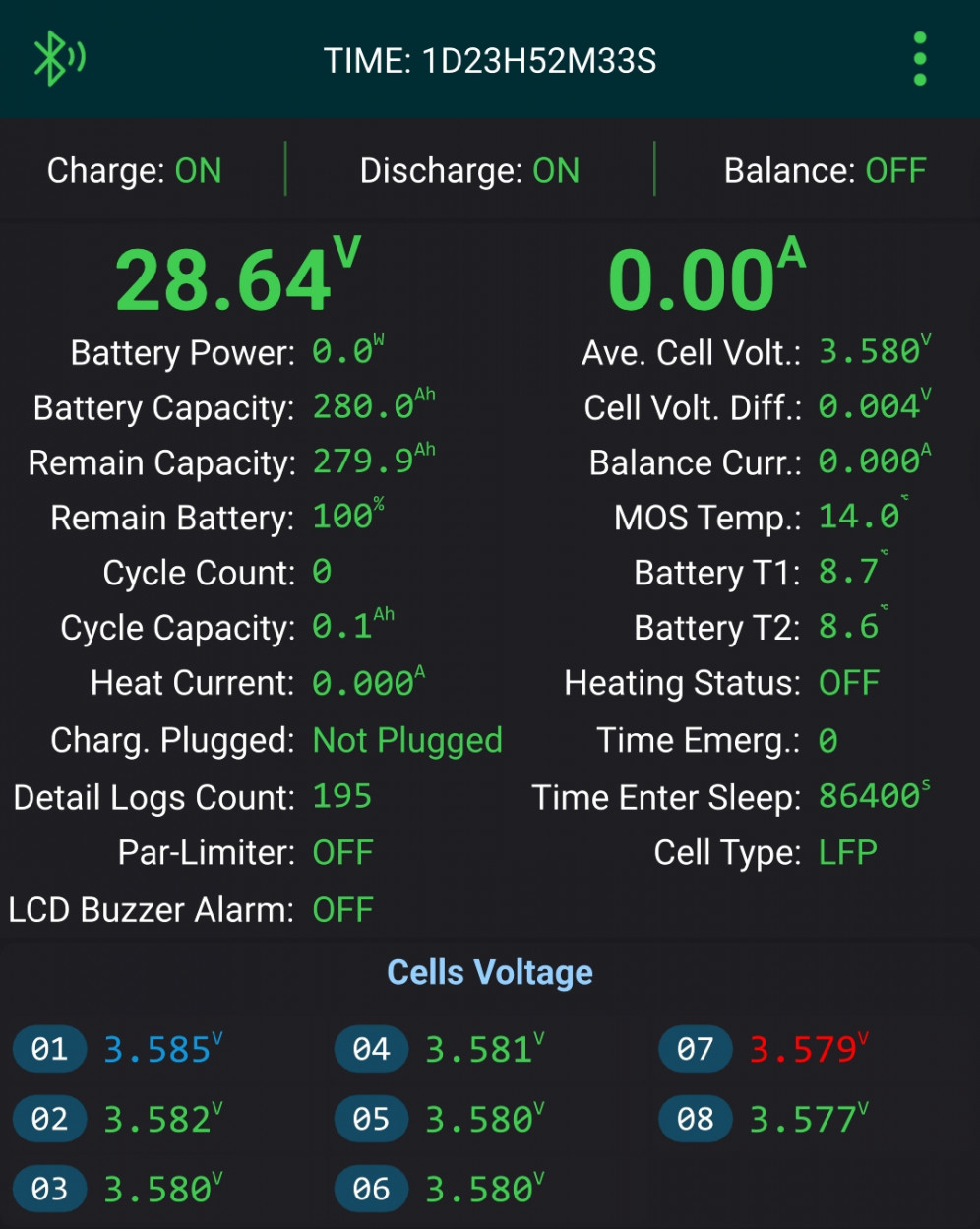 Na úplném konci balancingu, poté, co články došly na napětí kolem 3.4V a byly pěkně srovnané, jsem přenastavila BMSku na standardní hodnoty: 3.65V OVP a zvýšila jsem nabíjecí napětí. Pak jsem si počkala, až se napětí článků ustálilo na 3,58V a napětí celé baterie bylo kolem 28,65V. Takhle vysoko už tuhle baterii v běžném provozu doufám dlouho neuvidím, proto screenshot vpravo.