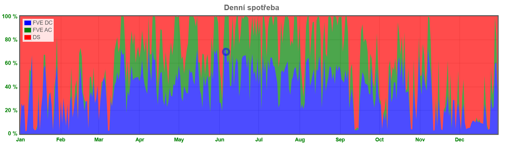O rok dřív se moje spotřeba červenala mnohem víc. Konkrétně lze vývoj meziroční soběstačnosti vyčíst z této agregace: