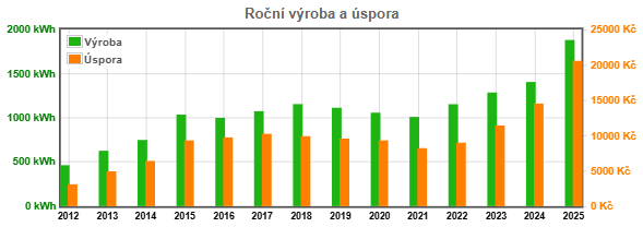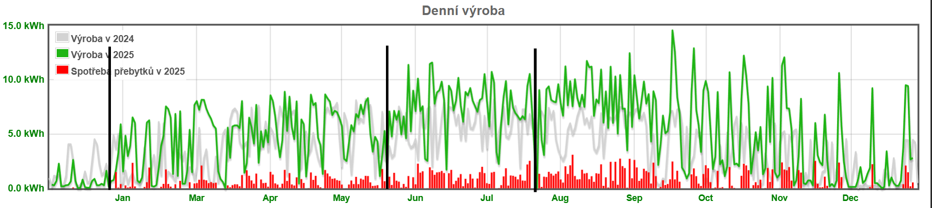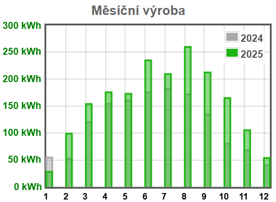 Všechny měsíce roku 25, kromě ledna, byly na výrobu lepší než o rok dříve. Letošní prosinec ještě neskončil, ale půjde max o 10kWh.