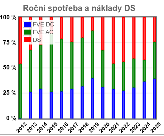 Důležitějším ukazatelem je poměr vlastní s kupované energie v mé spotřebě. Rok 2025 dopadl takto: